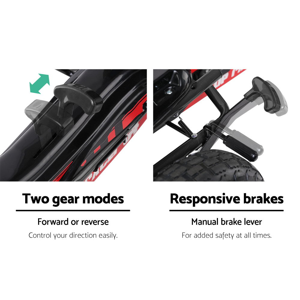 Made of a very sturdy steel frame with oxygen-welded joints for extra stability and durability, the Kids Go Kart has a large and adjustable seat with a high back rest for maximum comfort. Pedal power is assisted by a forward and reverse control and a sporty and highly responsive 3-point steering wheel. The large pneumatic rubber tyres provide good grip and traction as well as good shock absorption for a smooth ride. And for safety, the bike chain is fully covered to prevent any injury whilst the manual brake is super effective too. Not least, the striking colours and finishing simply look awesome.